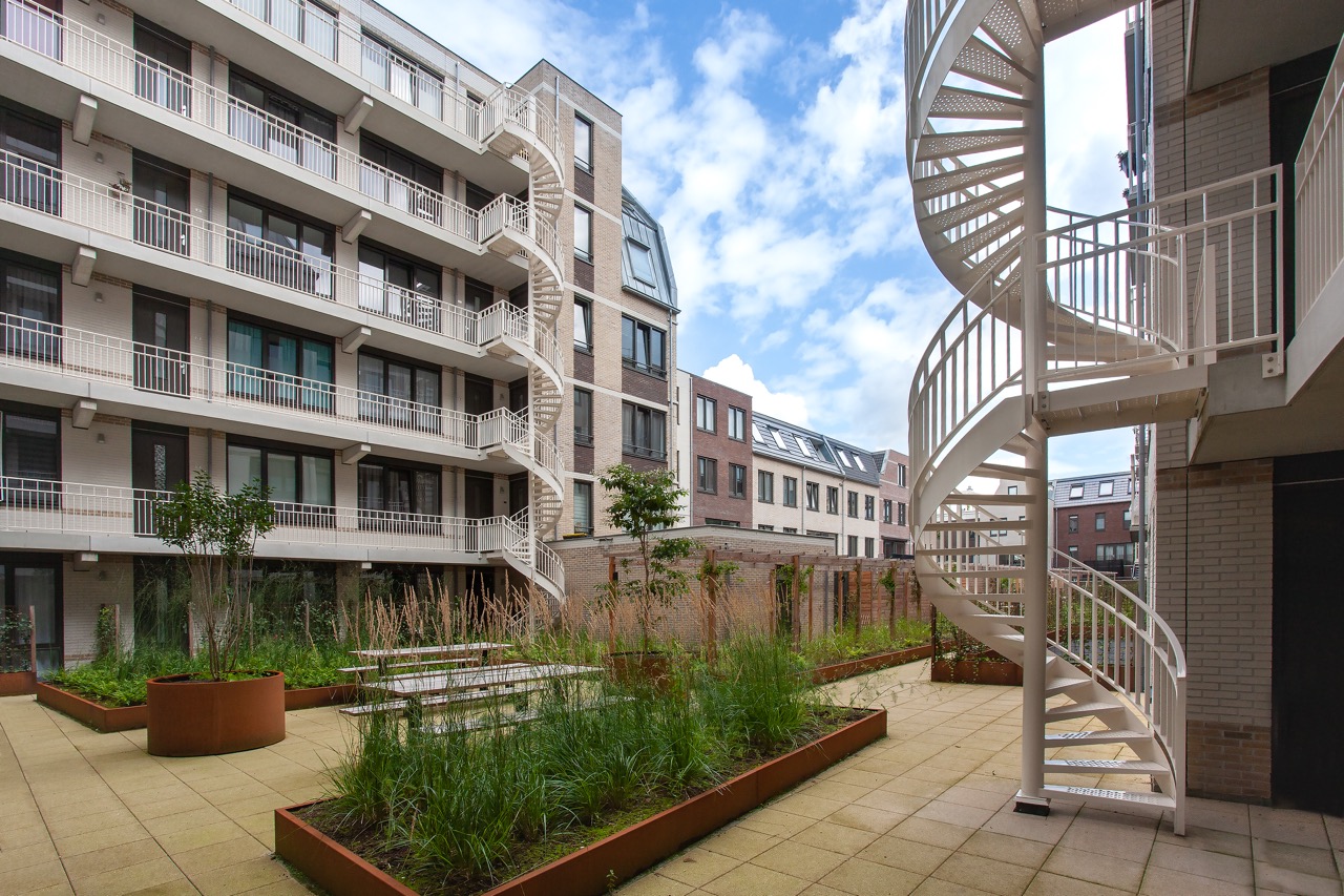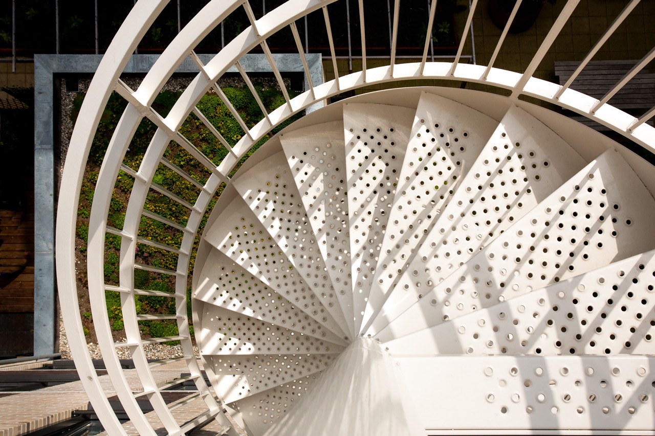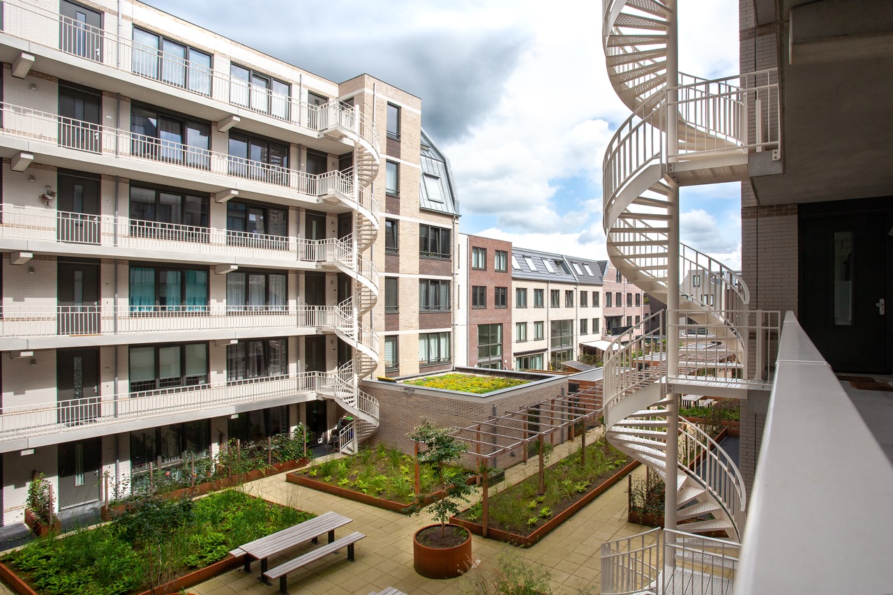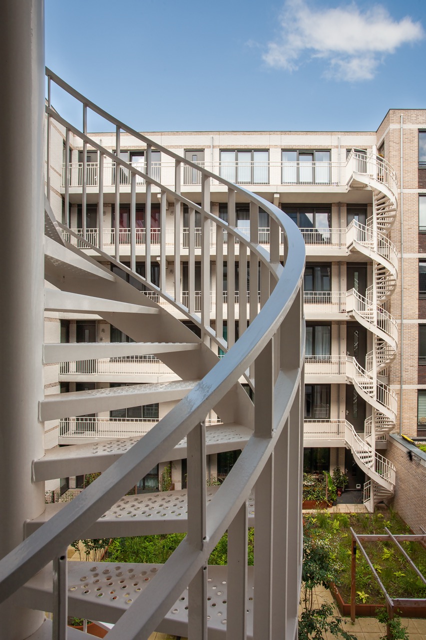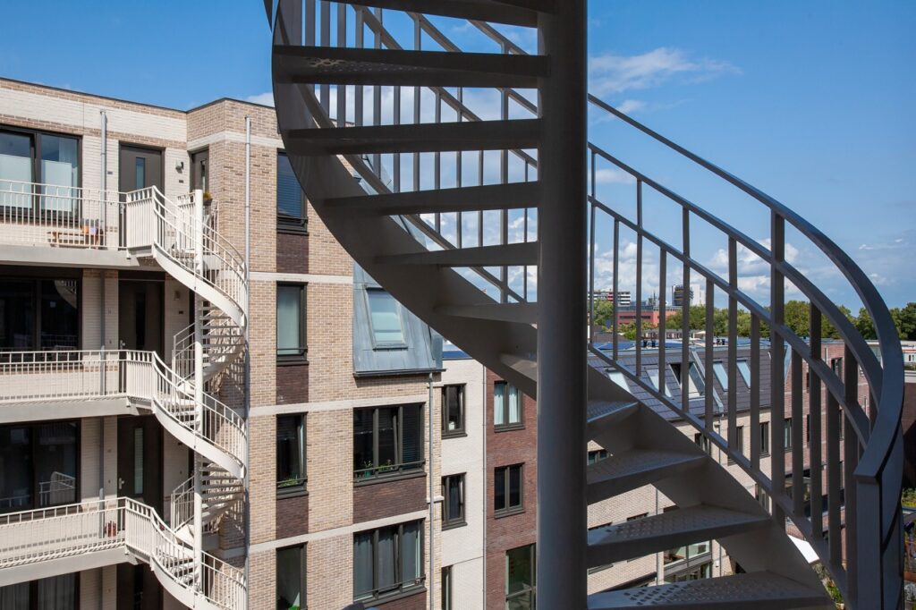 Zijdebalen ligt op loopafstand van het historische hart van Utrecht. Het stedenbouwkundig plan bestaat uit vier woonblokken met in totaal ruim 480 woningen. Hier zijn spiltrappen gerealiseerd met dubbele rechthoekige leuningen (6-hoog en 5-hoog). Welke thermisch verzinkt en gepoedercoat zijn in de kleur wit.